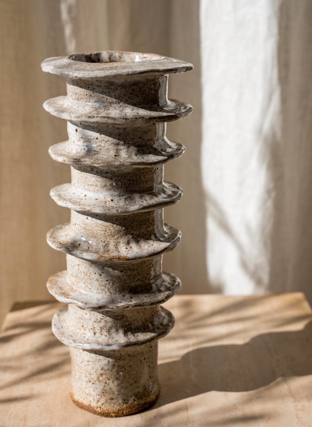 The colors used on the vase are muted and natural, evoking a sense of serenity and calmness that is often associated with Japanese design. The layering of the pinched coils gives the vase a sense of depth and dimension, making it a captivating piece that is sure to draw attention.